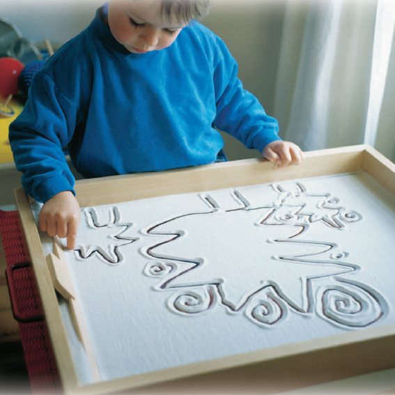 Codice articolo: 44804 Tracciare segni sulla sabbia con uno strumento, e più ancora con le dita, è una attività spontanea e gratificante che bene introduce ai processi grafici della scrittura e che può avere valenze terapeutiche o anche farsi espressione artistica. In faggio massello con piano in vetro di sicurezza Il vassoio misura cm 65…